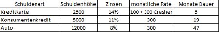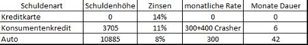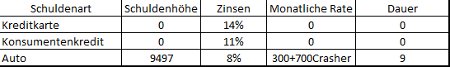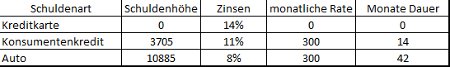 Sie verkürzen also die Zahlungsdauer von 30 auf 5 Monate. Jetzt haben Sie nur noch den Konsumentenkredit und den Autokredit. Den Konsumentenkredit können Sie jetzt zusätzlich mit den frei werdenden € 400 bedienen. Der Kredit ist nach 5 Monaten auf € 3705 der Autokredit auf € 10885.